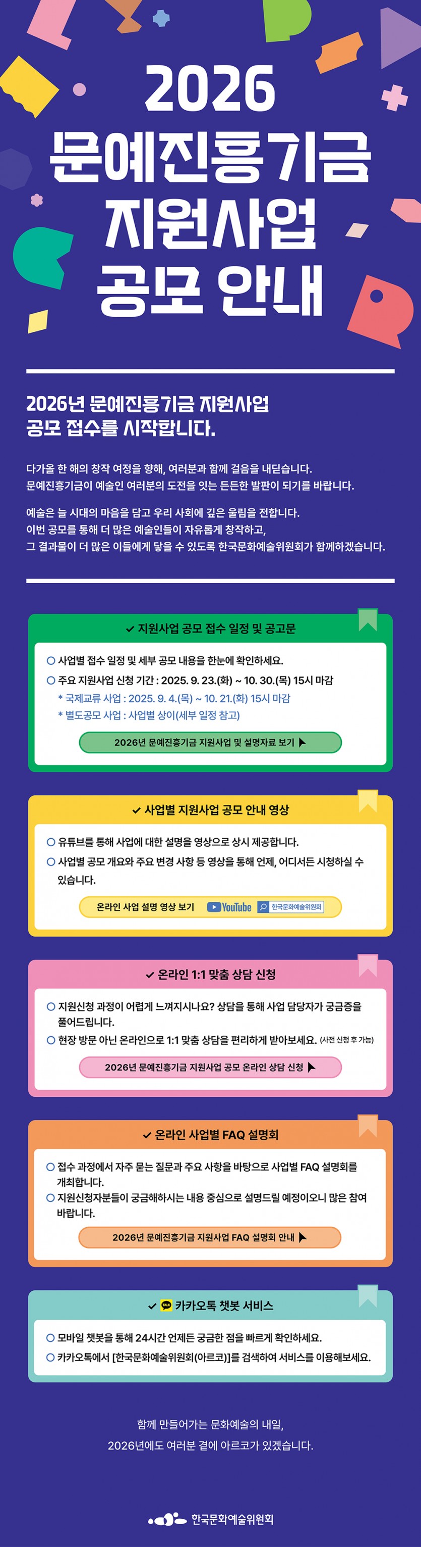 [한국문화예술위원회] 2026년 문예진흥기금 지원사업 공모 안내 페이지 정보 작성자 한국소설가협회 (119.♡.172.10) 댓글 0건 조회 254회 작성일 25-09-24 17:46 목록 본문 [한국문화예술위원회] 2026년 문예진흥기금 지원사업 공모 안내참고 링크 = 한국문화예술위원회 > 공모안내 > 사업공모 > 문예진흥기금 공모 한눈에 보기 > 2026 이전글교과용도서, 수업목적, 수업지원목적 및 도서관 보상금 분배공고 25.09.24 다음글최성배 소설가 장편소설 <<맹수들>>출간 화제 25.09.12 댓글 0 댓글목록 등록된 댓글이 없습니다.