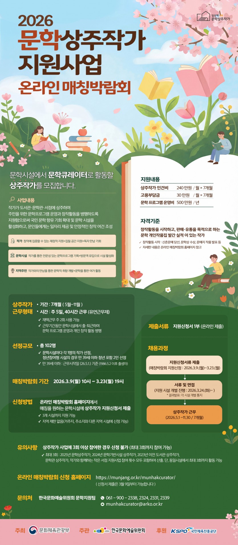 문화체육관광부와 한국문화예술위원회는 작가에게 안정적인 창작 여건을 제공하고 지역 주민의 문학 향유 기회를 확대하기 위해 문학상주작가 지원사업을 추진하고 있습니다. 아래 내용을 확인하시기 바랍니다.