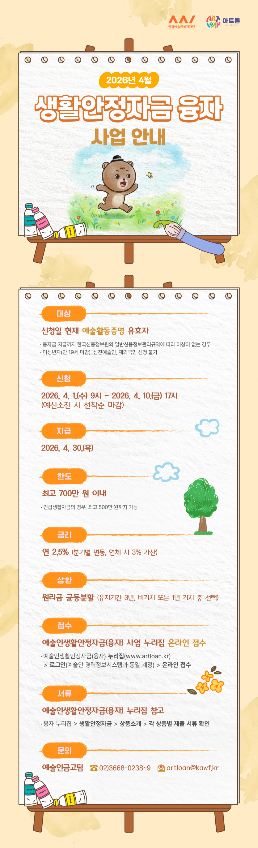 [한국예술인복지재단] 2026년 4월 생활안정자금(융자) 사업 페이지 정보 작성자 한국소설가협회 (119.♡.172.10) 댓글 0건 조회 33회 작성일 26-03-20 10:14 목록 본문 [한국예술인복지재단] 2026년 4월 생활안정자금(융자) 사업 이전글제 12차 조선왕릉답사 안내합니다.( 의릉 답사) 26.03.27 다음글우선덕 소설가, 제17회 김우종문학상 대상 수상 26.03.19 댓글 0 댓글목록 등록된 댓글이 없습니다.