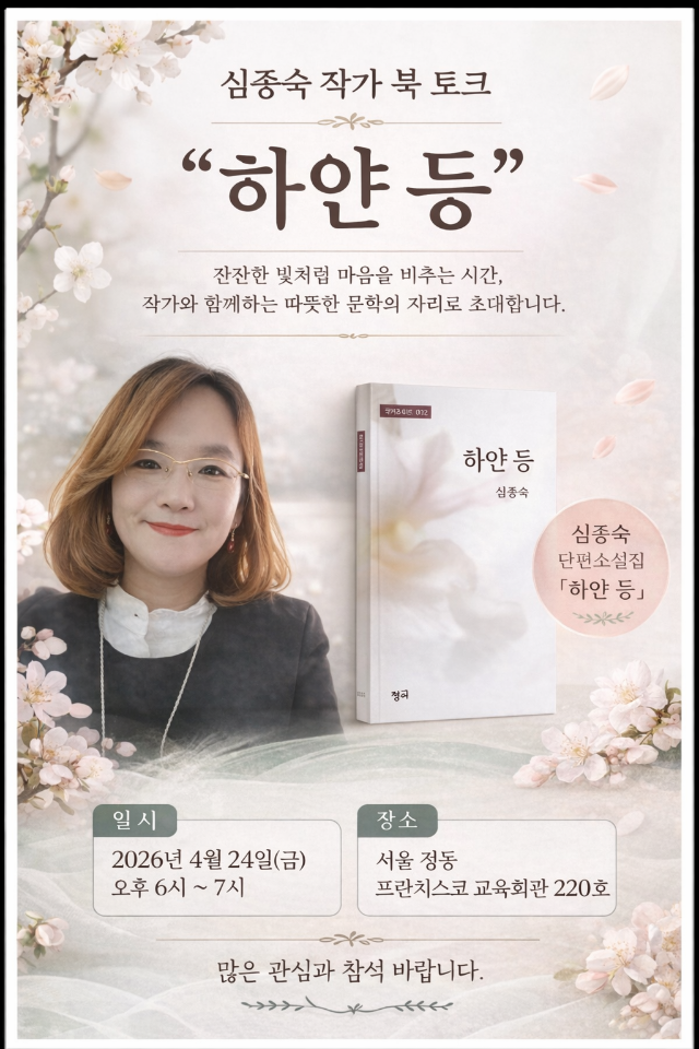 심종숙 소설가의 단편소설집 『하얀 등』 북토크 행사가 2026년 4월 24일(금) 오후 6시에 서울 정동 프란치스코 교육회관 220호에서 열린다.