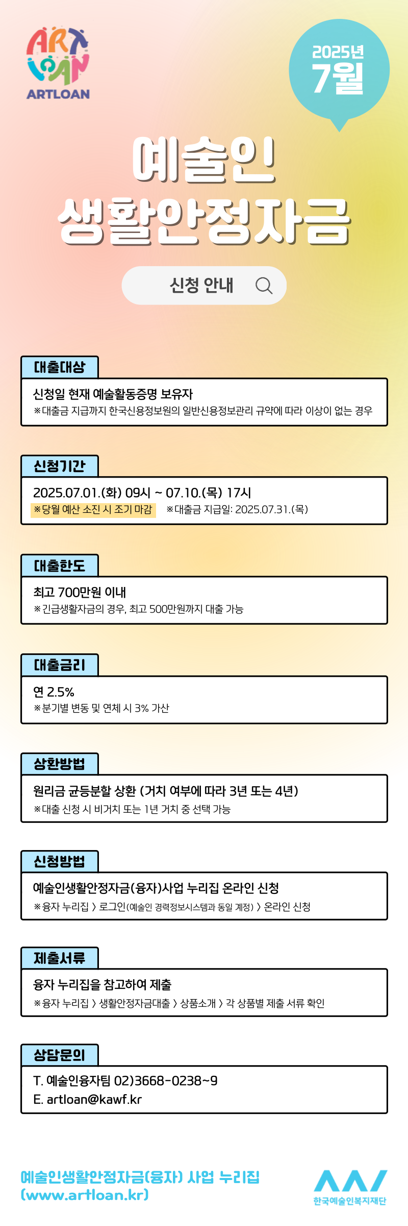 [한국예술인복지재단] 2025년 7월 예술인생활안정자금(융자)사업 안내